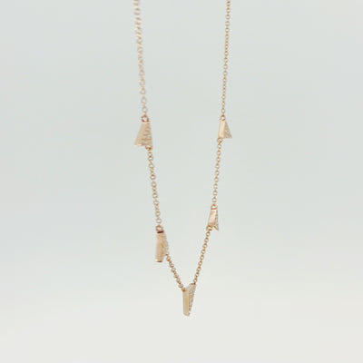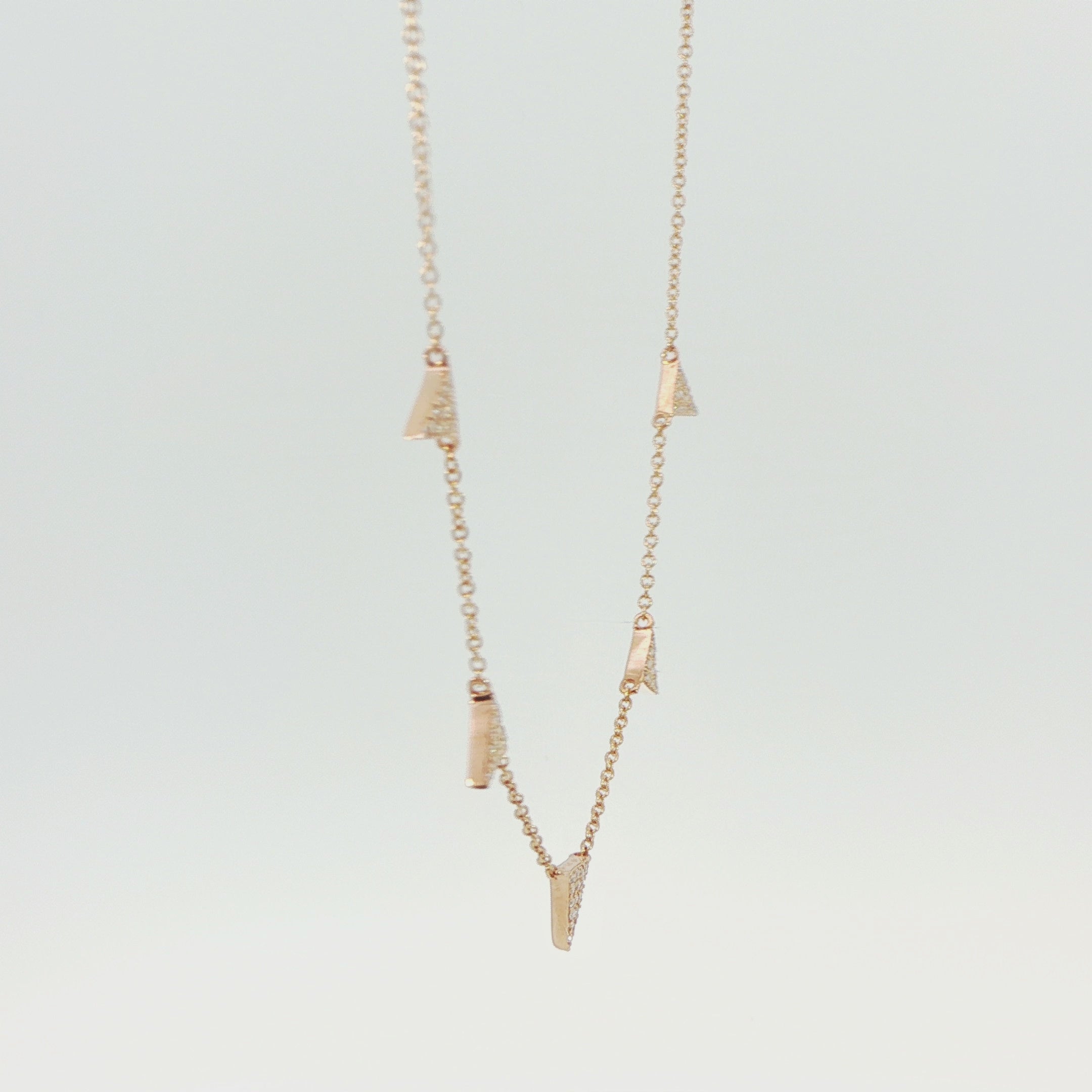 A modern symbol of style and individuality, this distinctive necklace offers a contemporary twist on timeless luxury. Crafted in warm 14ct rose gold, the design is beautifully accented with five geometric triangle stations, each intricately set with multiple round brilliant-cut diamonds. Their captivating sparkle creates a rhythmic play of light across the neckline, resulting in a piece that feels both refined and effortlessly chic.