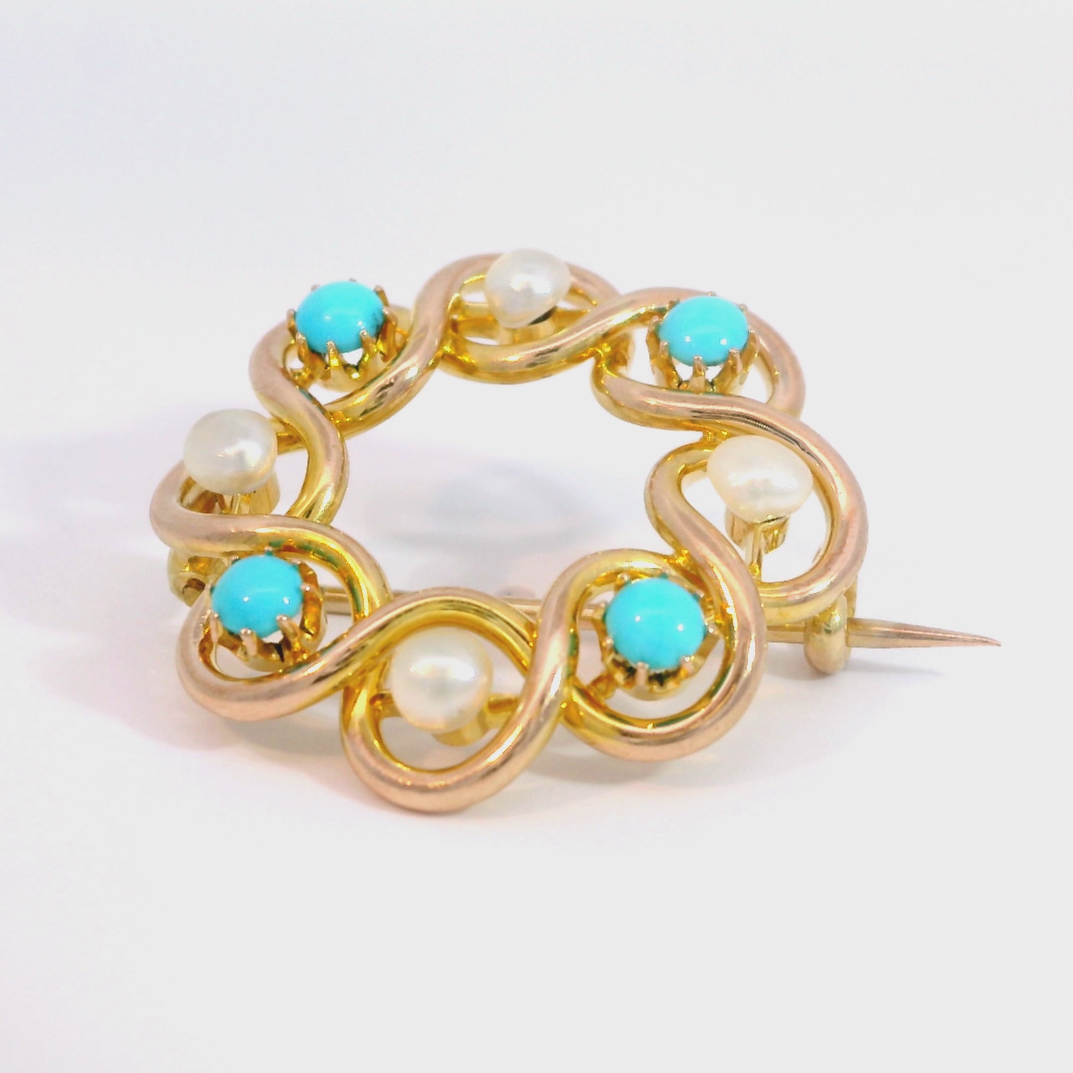 A graceful ode to vintage charm, this captivating brooch embodies timeless elegance and refined craftsmanship. Handcrafted in rich 14ct yellow gold, the circular design is formed from interwoven curves, symbolising unity and continuity. Set within the flowing gold are alternating round turquoise gemstones—celebrated for their vibrant hue and protective qualities—and lustrous seed pearls, each radiating soft iridescence.