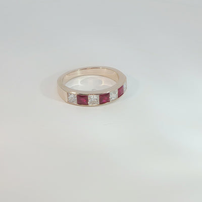 A luxurious expression of colour and brilliance, this exquisite half eternity ring is crafted in warm 18ct rose gold—beautifully balancing modern refinement with timeless elegance. Showcasing a vibrant arrangement of princess-cut rubies totalling 0.60ct, paired seamlessly with 0.80ct of princess-cut diamonds, the design radiates both richness and precision. Each stone is expertly channel set, creating a sleek, uninterrupted flow of sparkle and colour across the band.