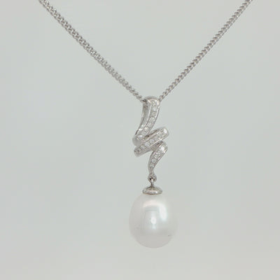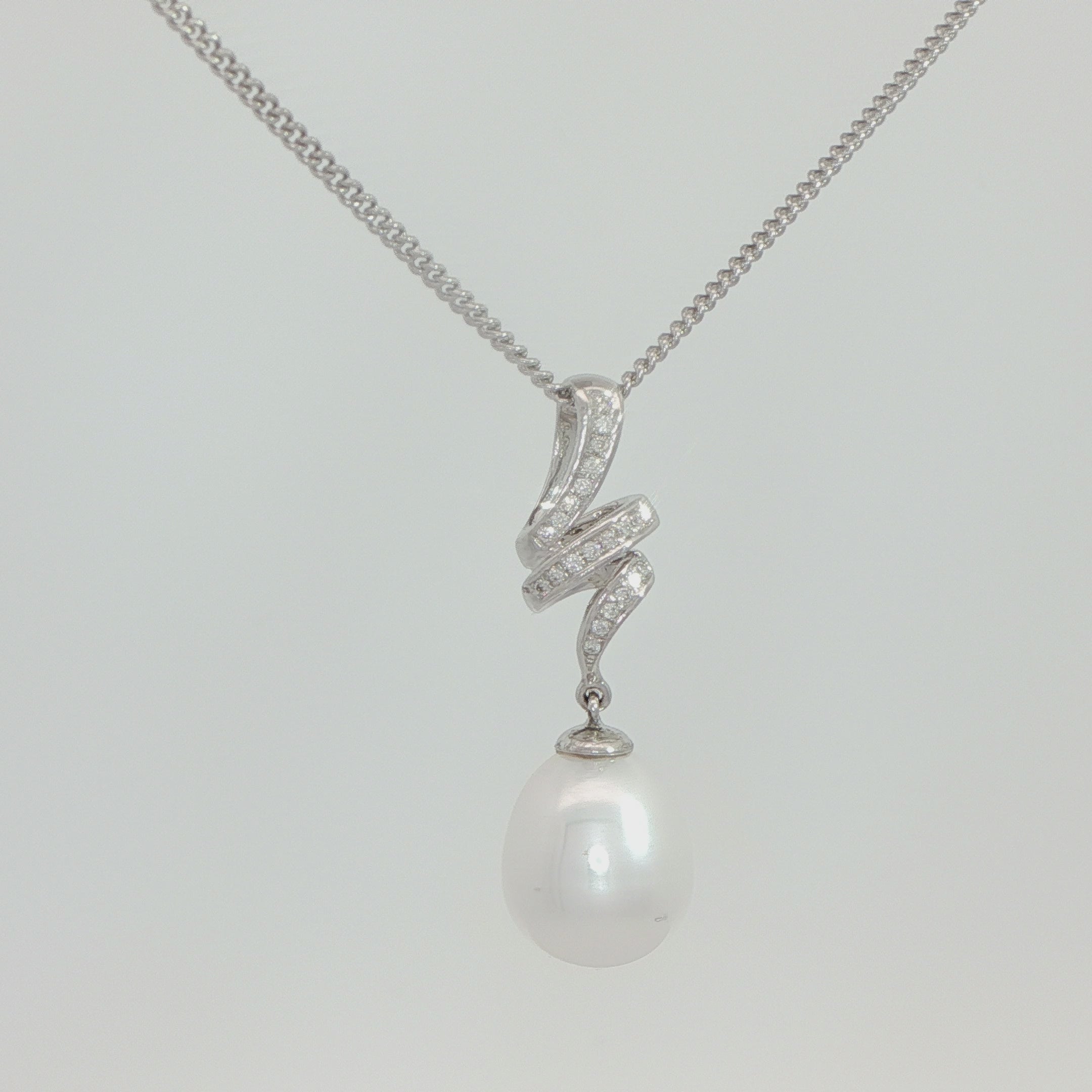 18 Carat White Gold Cultured Pearl and Diamond Drop Pendant on Chain