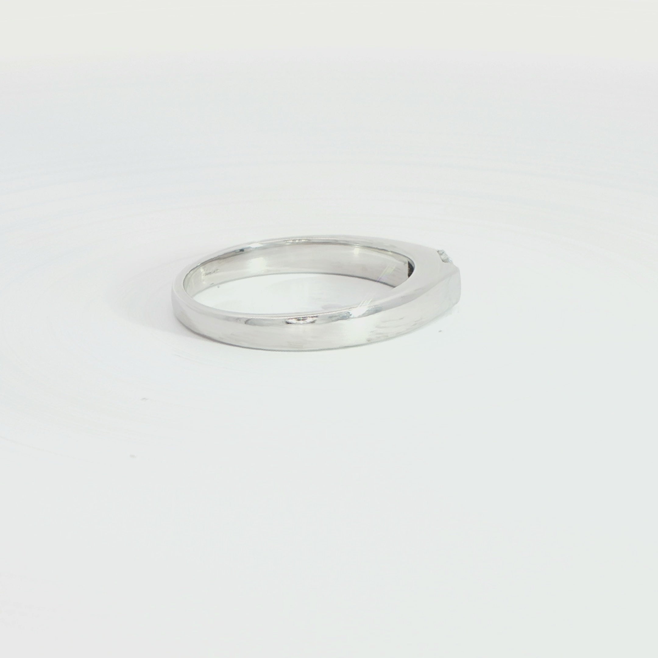 The band broadens gracefully to approximately 3.2mm at its widest point, giving the ring a confident presence while maintaining a smooth, comfortable fit. Finished in a ring size J, this design is ideal for those who favour minimalist elegance with a modern edge.