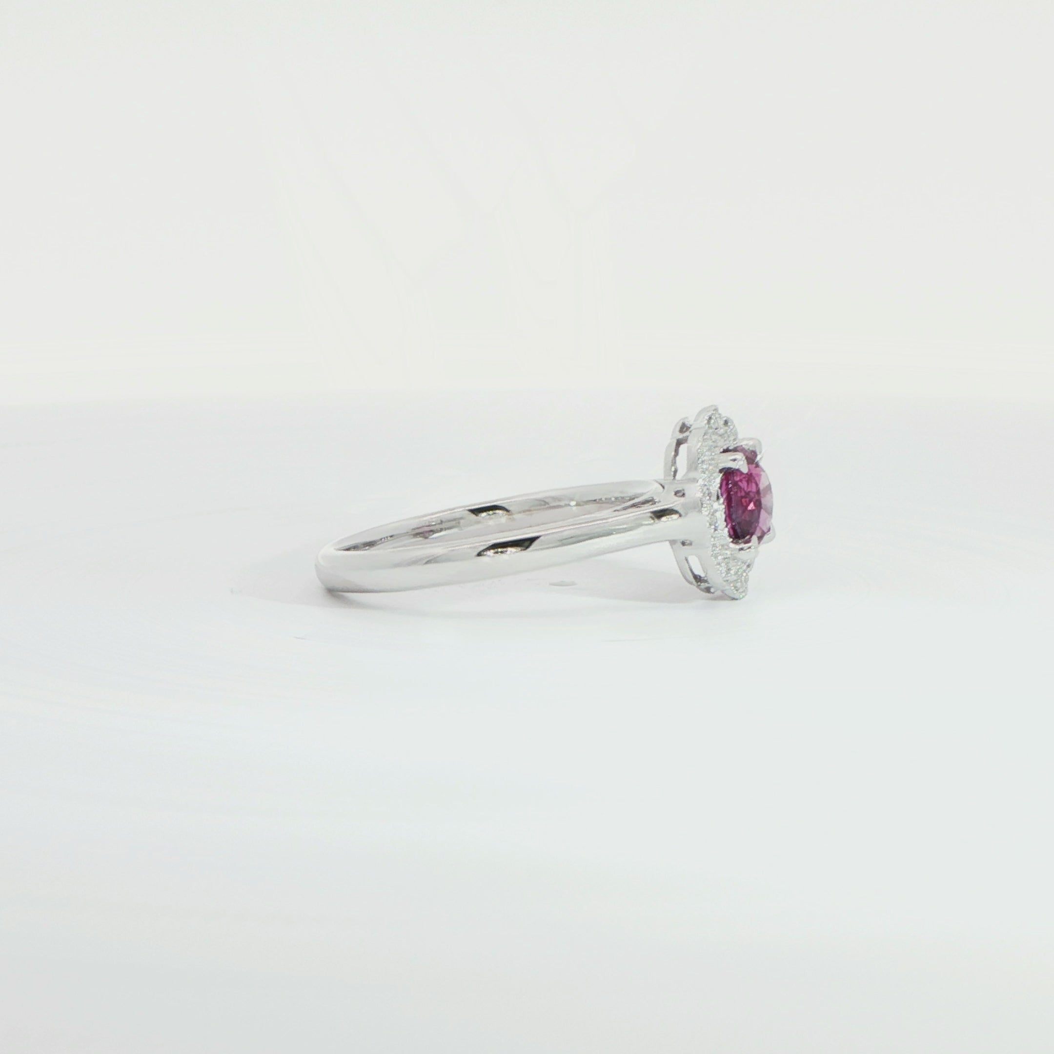 The refined white gold band measures approximately 2.1mm in width, offering a graceful and comfortable fit while allowing the intricate halo setting to take centre stage. A truly charming and sophisticated ring, ideal for marking a special moment or adding a touch of refined colour to any fine jewellery collection.
