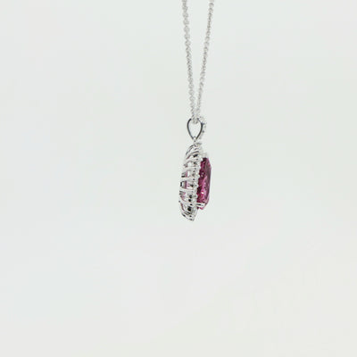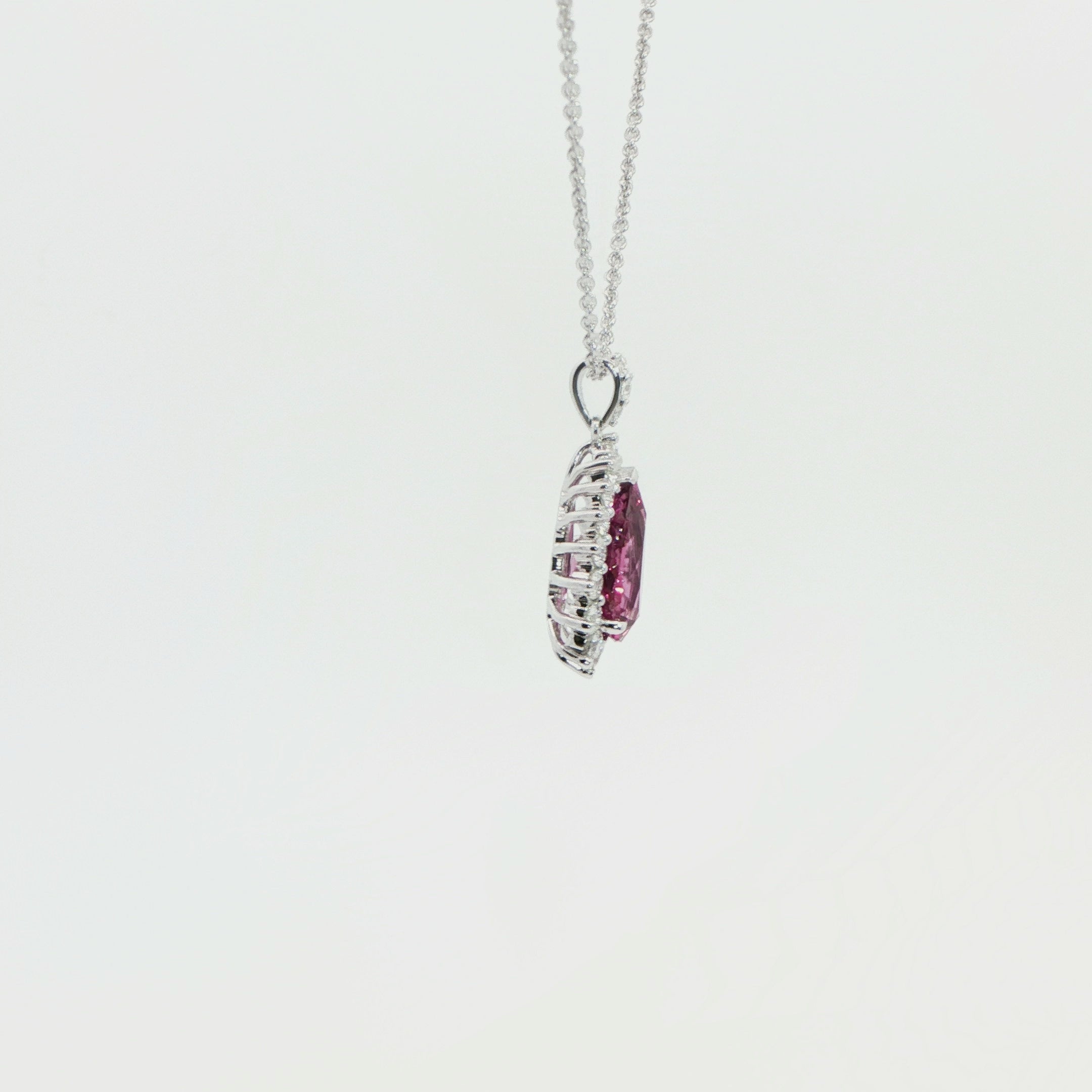A captivating blend of colour and brilliance, this exquisite drop pendant is crafted in luminous 18ct white gold and showcases a breathtaking 2.01ct pear-shaped rose garnet at its heart. Rich in depth and saturated with warm, romantic hues, the centre stone is beautifully complemented by a halo of meticulously claw-set round brilliant-cut diamonds, with additional diamonds accenting the bail for added radiance. With a total diamond weight of approximately 0.44ct, this piece sparkles from every angle.