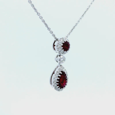 A vibrant expression of romance and luxury, this 18ct white gold drop pendant showcases the captivating beauty of ruby in a refined and graceful silhouette. Featuring one round ruby and one pear-shaped ruby, totalling 0.57ct, the design highlights the natural allure of each stone. The rubies are elegantly framed and separated by round brilliant-cut diamonds totalling 0.16ct, adding a delicate sparkle that enhances the pendant’s radiant depth.