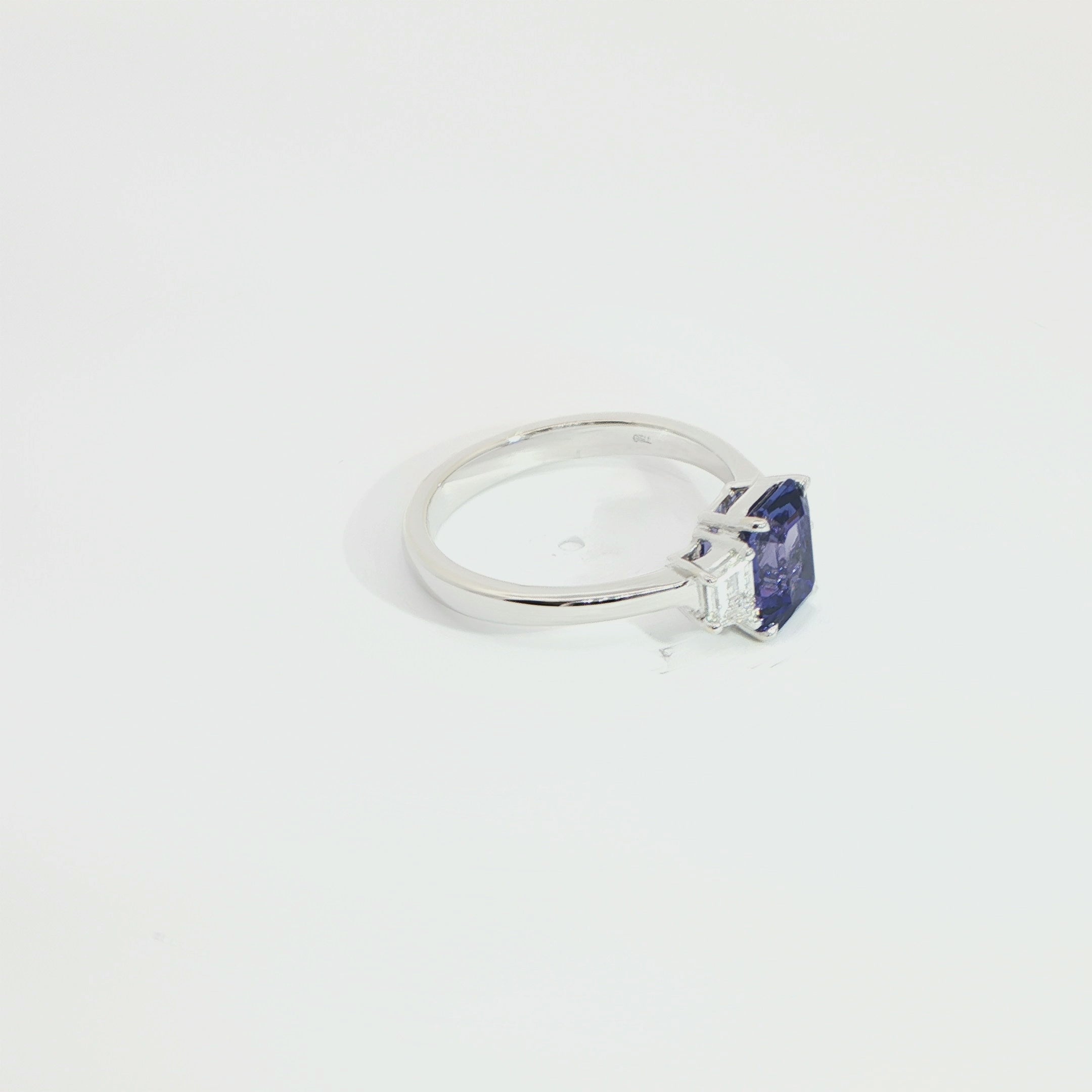 A striking fusion of colour and contemporary refinement, this three-stone ring offers a fresh interpretation of a timeless classic. Handcrafted in polished 18ct white gold, it features a captivating 1.61ct emerald-cut tanzanite, celebrated for its rich violet-blue hue and exceptional clarity. Flanking the centre stone are two beautifully matched trapezoid-cut diamonds, totalling approximately 0.37ct, their clean geometry and brilliance enhancing the ring’s balanced, modern silhouette. Each stone is securely held in refined claw settings, allowing light to flow effortlessly through the design.