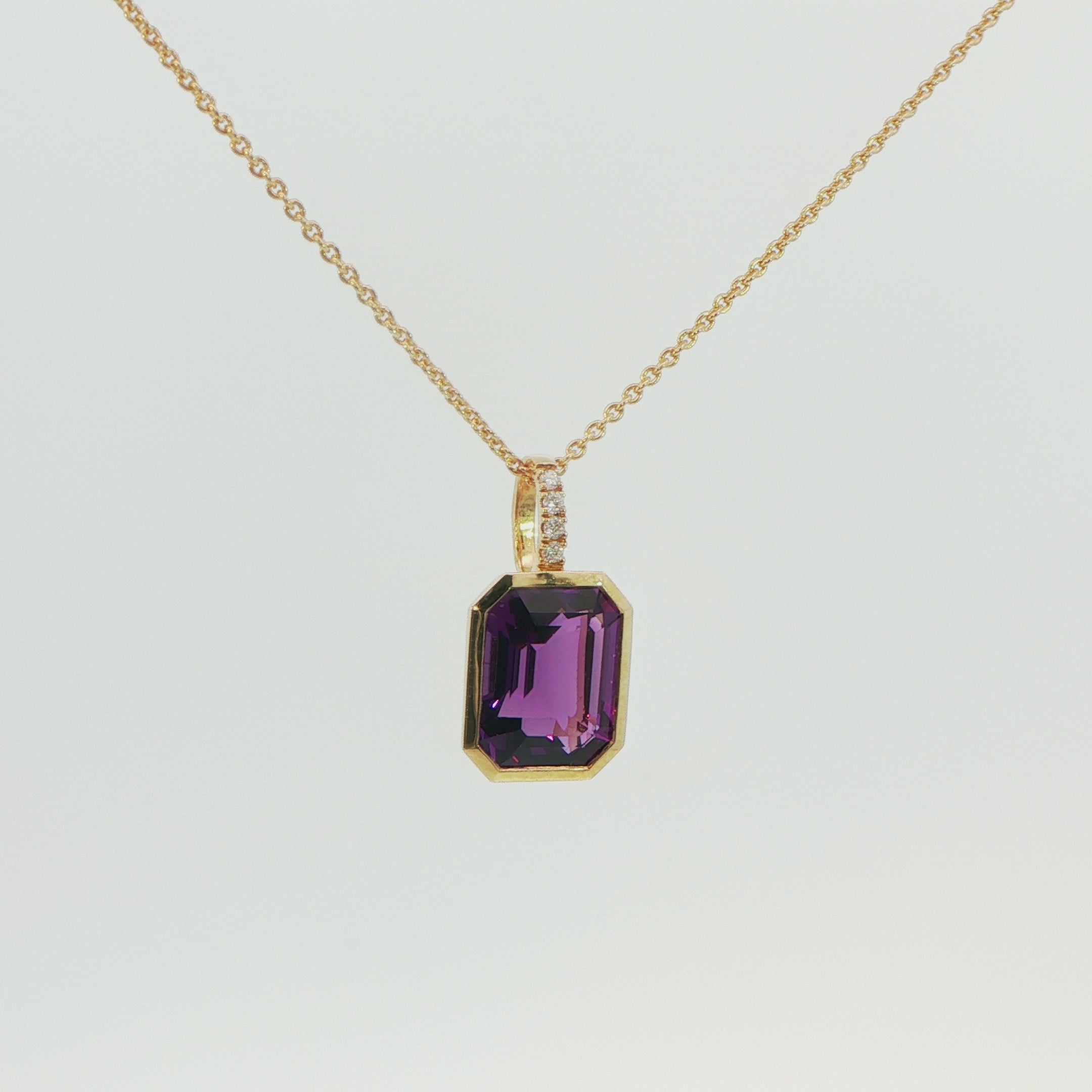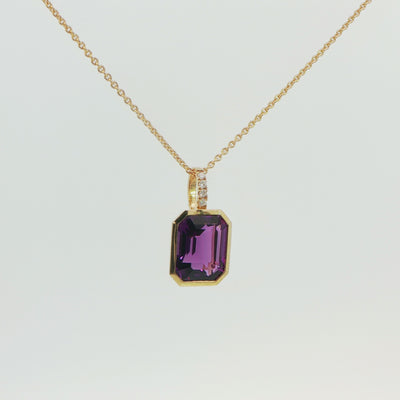A refined expression of elegance and serenity, this stunning pendant features a beautifully proportioned 2.89ct emerald-cut amethyst—celebrated for its calming energy and regal violet hue. The gemstone is confidently showcased within a smooth rub-over setting, allowing its crisp facets and rich colour to take centre stage while offering a sleek, contemporary aesthetic.