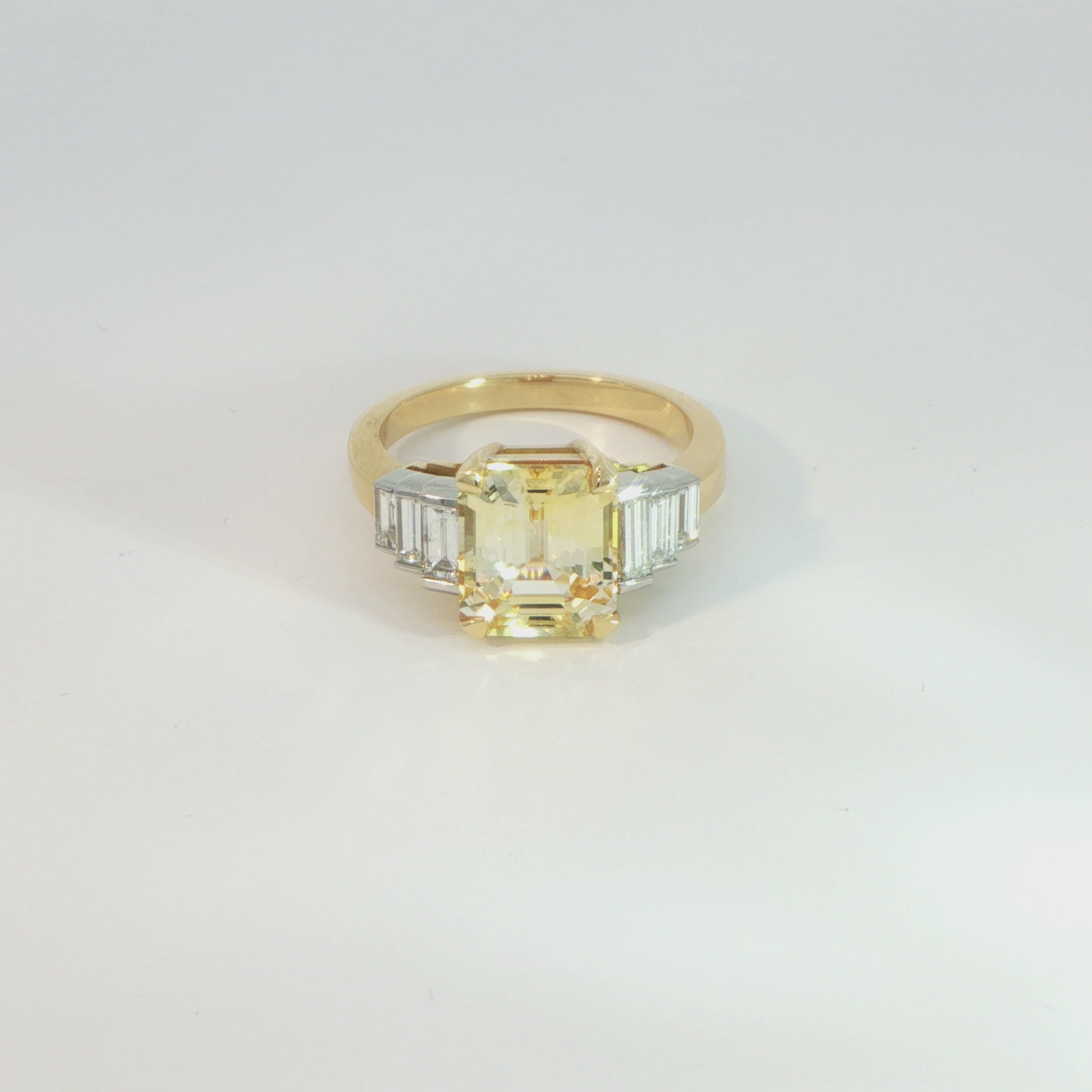 A striking celebration of vintage elegance, this handcrafted ring draws inspiration from the bold geometry of the Art Deco era. Expertly made in our workshop, the design features a captivating emerald-cut yellow sapphire, weighing approximately 4.05ct, set in a classic four-claw setting to showcase its rich golden hue and exceptional clarity.