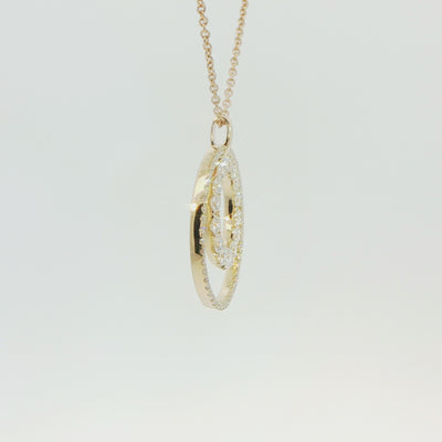 A stunning expression of movement and light, this exquisite circular pendant is crafted in radiant 18ct yellow gold. Designed with both an outer circle and an articulated inner circle, the piece dances beautifully with every motion, catching and reflecting light from all angles. Each circle is adorned with meticulously set round brilliant-cut diamonds, totalling an impressive 1.22ct of dazzling brilliance.