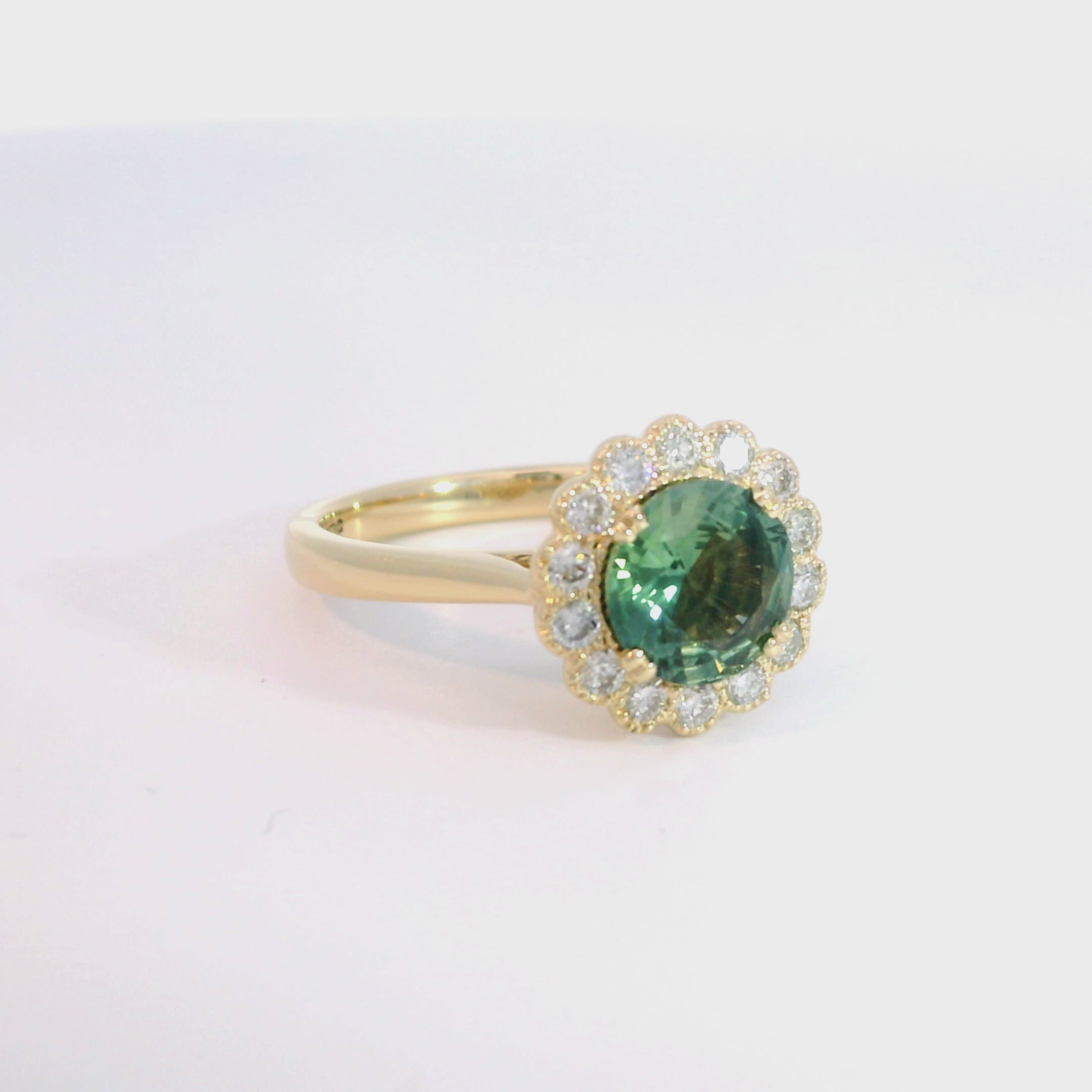 18 Carat Yellow Gold Green Sapphire and Diamond Halo Ring