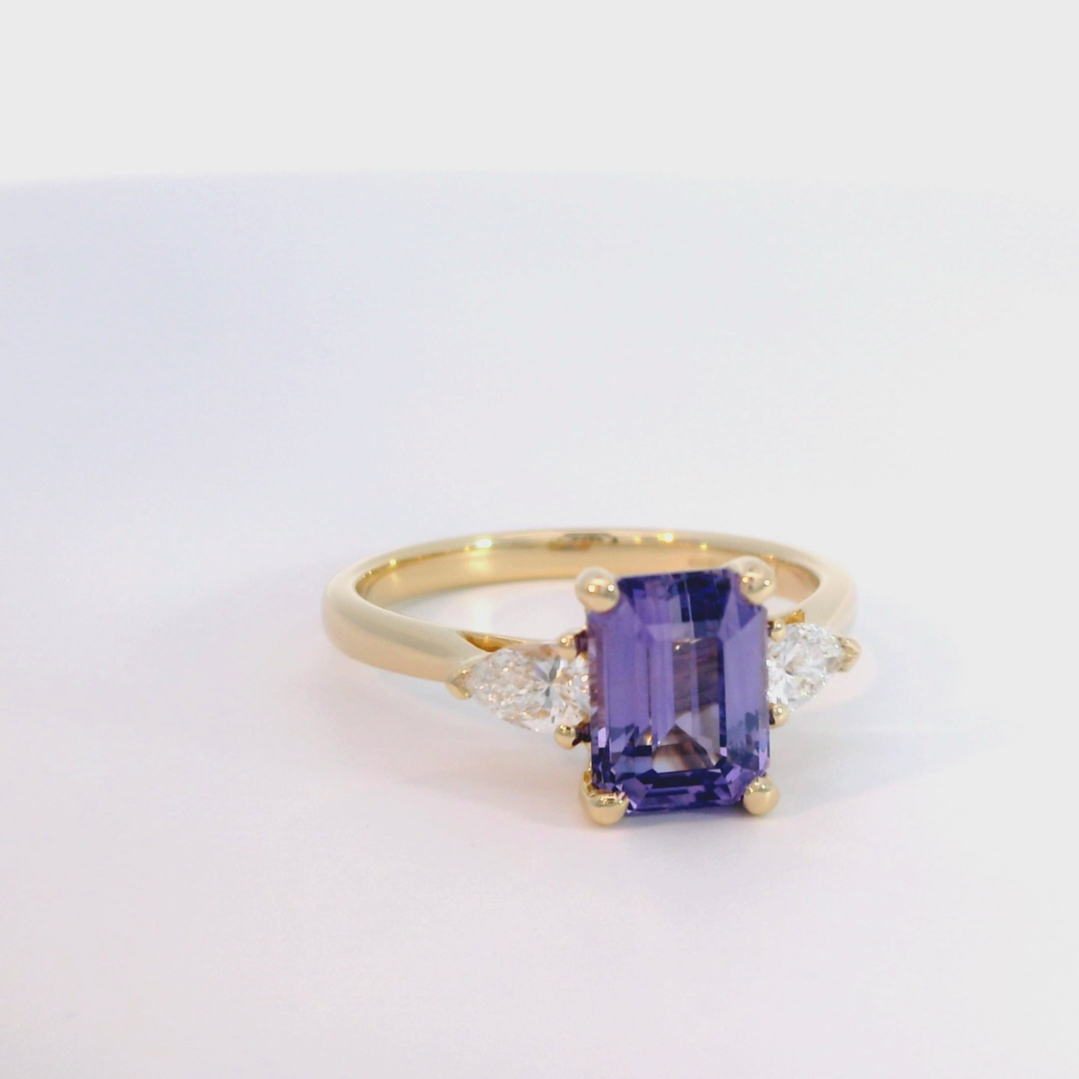 A captivating display of colour and craftsmanship, this elegant three-stone ring radiates sophistication and charm. Beautifully handcrafted in rich 18ct yellow gold, it features a striking 2.07ct emerald-cut purple lilac sapphire at its centre — a gemstone admired for its enchanting blend of soft violet and pastel tones. Flanking the sapphire are two exquisite pear-shaped diamonds, totalling approximately 0.31ct, their brilliance perfectly complementing the sapphire’s serene luminosity.