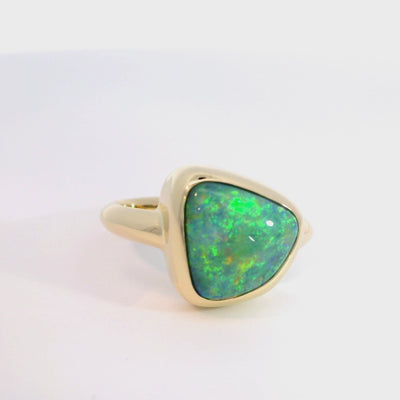 A celebration of nature’s artistry and craftsmanship, this organic handmade ring captures the allure of fluid design and vivid colour. Expertly crafted in rich 18ct yellow gold, it showcases a mesmerising opal alive with flashes of green, blue, and yellow fluorescents. The opal, measuring approximately 11mm, is securely embraced in a smooth rub-over setting that enhances both its iridescence and natural beauty.