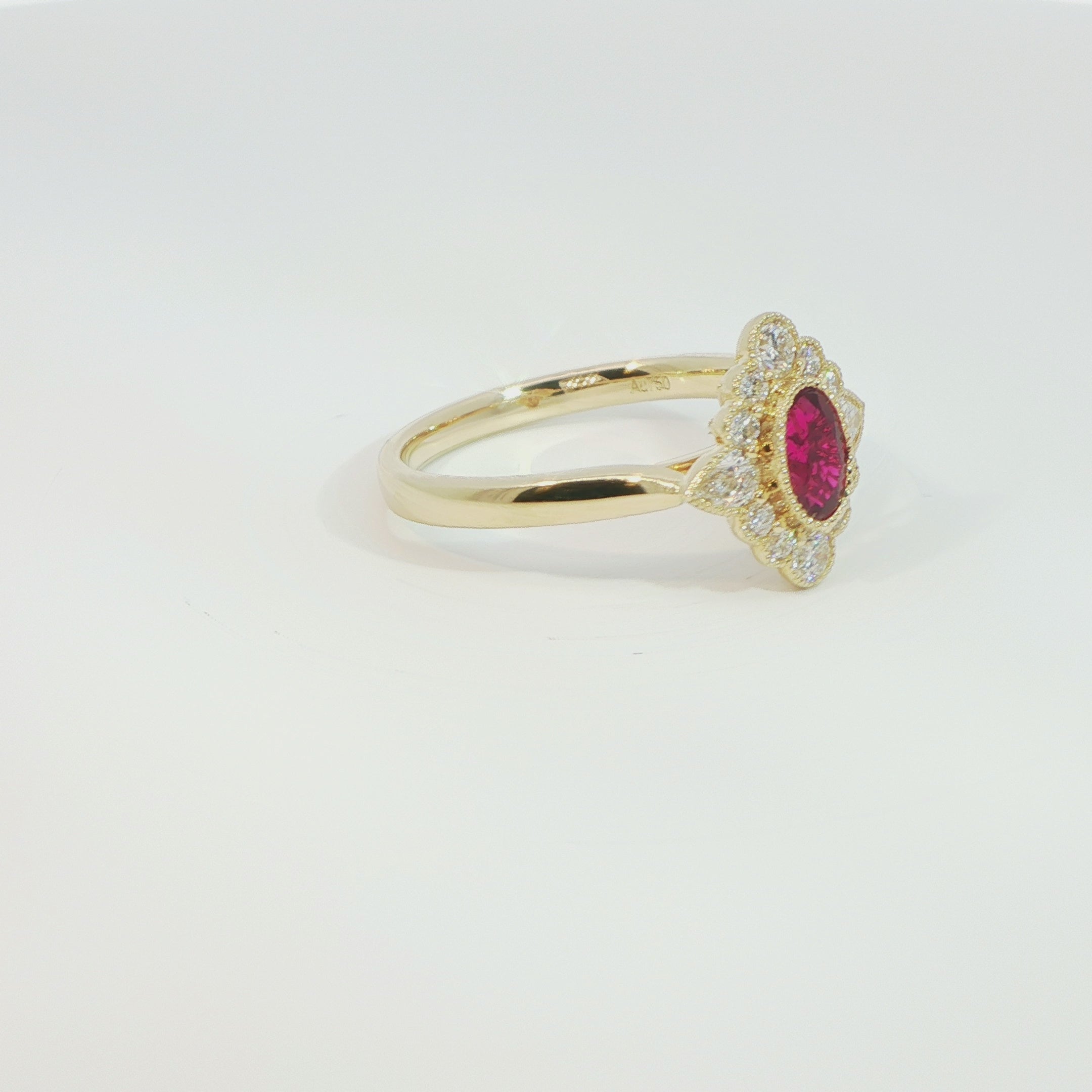 Framing the ruby are two pear-shaped diamonds totalling 0.17ct, their gentle taper enhancing the ring’s graceful silhouette. Completing the design are ten round brilliant-cut diamonds, totalling 0.30ct, each meticulously set in a delicate beaded setting to maximise sparkle and texture. Together, these stones form an elegant marquise-shaped arrangement that elongates the finger and creates a captivating presence.