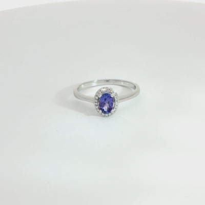 Delicate yet captivating, this tanzanite and diamond halo ring is a timeless expression of elegance and colour. Crafted in 9ct white gold, the design centres around a beautiful oval-cut tanzanite, measuring approximately 5.8mm x 4mm, held securely in a classic four-claw setting. Its enchanting violet-blue tones create a soft yet striking focal point.