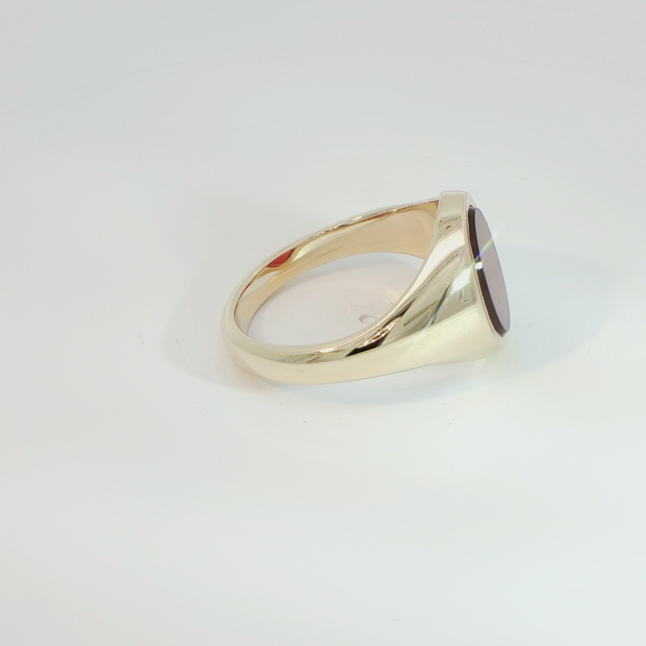 A timeless symbol of heritage and personal style, this classic signet ring embraces understated sophistication. Crafted in lustrous 9ct yellow gold, it features a smooth oval carnelian, measuring approximately 11 x 9mm. Known for its warm, earthy hue and historical significance, the gemstone lends the ring a distinguished and meaningful presence. The polished gold bezel enhances the stone’s depth and character while ensuring secure, enduring wear.