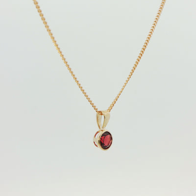 A timeless expression of warmth and rich colour, this elegant pendant is crafted in 9ct yellow gold and features a beautifully vibrant round garnet. Set in a smooth rub-over setting, the garnet displays deep, fiery tones that symbolise passion, energy, and enduring elegance.