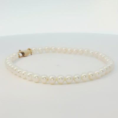 A timeless embodiment of elegance, this exquisite pearl bracelet showcases the natural beauty and classic charm of cultured pearls. Each 4–4.5mm cream-lustre pearl is gracefully strung to create a soft, radiant glow around the wrist, offering a look that is both understated and luxurious. The bracelet is finished with a polished 9ct yellow gold lobster clasp, providing a secure and refined closure.
