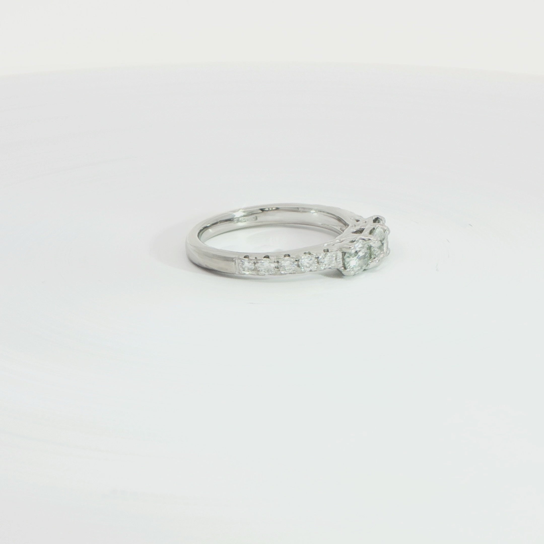 The ring is set with a total diamond weight of approximately 1.00 carat, with all stones secured in traditional claw settings to maximise light and brilliance. Crafted in enduring platinum, the slender band measures approximately 2.2mm in width, offering a graceful and comfortable profile on the hand.