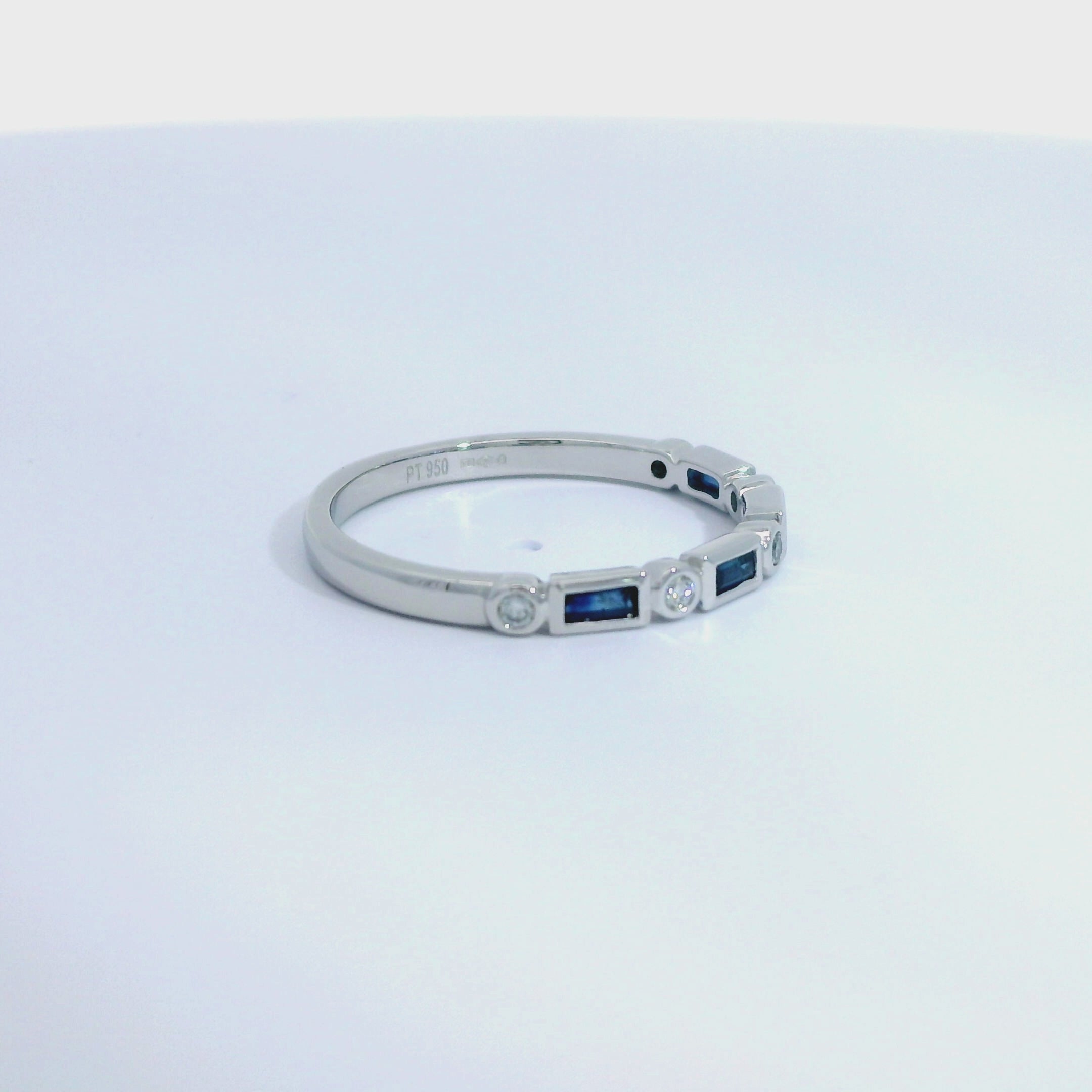 A beautiful fusion of vintage charm and refined elegance, this platinum half eternity ring draws inspiration from the timeless allure of Art Deco design. Meticulously crafted, it features a striking arrangement of four baguette-cut sapphires, totalling approximately 0.23ct, alternating with five round brilliant-cut diamonds, totalling approximately 0.08ct. The geometric precision of the sapphires contrasts beautifully with the soft sparkle of the diamonds, creating a piece that is both balanced and sophisticated.