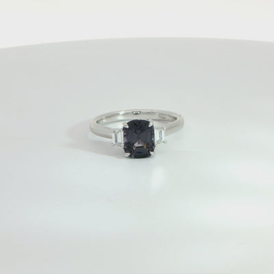 Striking and sophisticated, this platinum ring showcases the captivating allure of a richly coloured spinel, beautifully balanced with crisp diamond accents. At its centre sits a cushion-cut purple spinel, weighing approximately 1.72ct, secured in a classic claw setting that allows its vibrant hue and brilliance to shine.