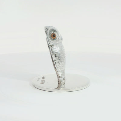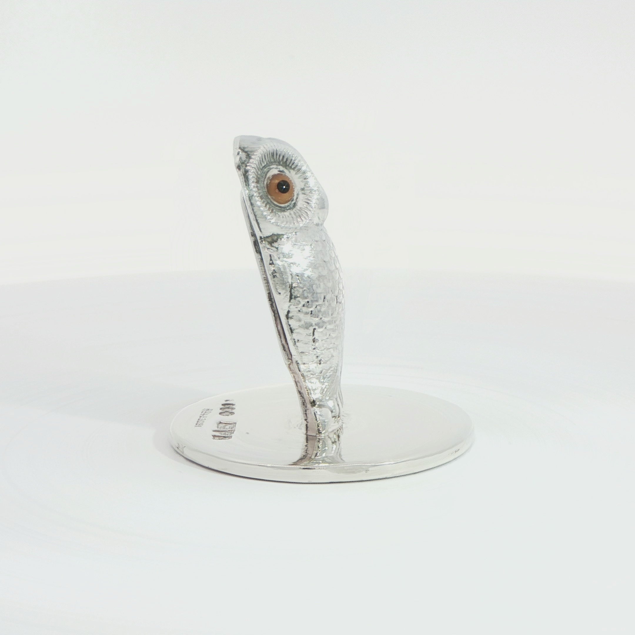 A charming symbol of wisdom and watchfulness, this delightful solid silver owl card or photograph holder is a beautifully crafted decorative accent, designed to bring both character and elegance to any interior. Featuring expressive glass eyes and finely detailed silverwork, the owl is seated on a polished silver base, creating a captivating display piece for a treasured photograph, place card or note.